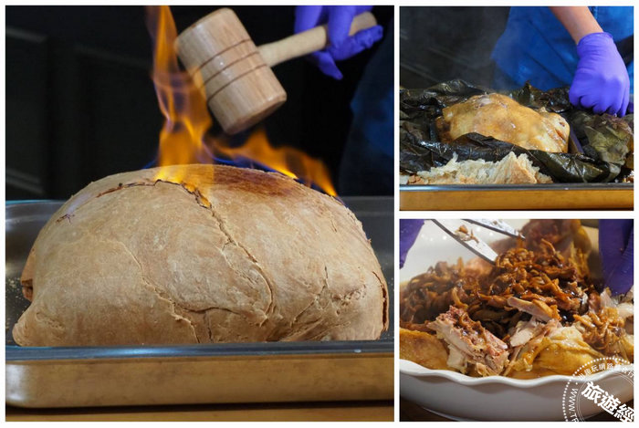 火焰富貴雞:源自於金庸小說裡的一道名菜,本以土包裹,簡師傅改以麵包,選用1.5公斤的跑山雞,先將雞隻以鹽、糖等調料醃製2.5小時後備用;接著以蠔油、鮑汁煨煮栗子、秀珍菇、冬菇、茶樹菇等8種配料,烹調後再將配料塞進雞身中,並先後依序以荷葉及麵粉皮包裹全雞,最後放入烤箱中烘烤三小時,才大功告成。上桌前,在桌邊淋上高度烈酒並點火燃燒,再以木槌破殼,取出內部的富貴雞再手撕分解。