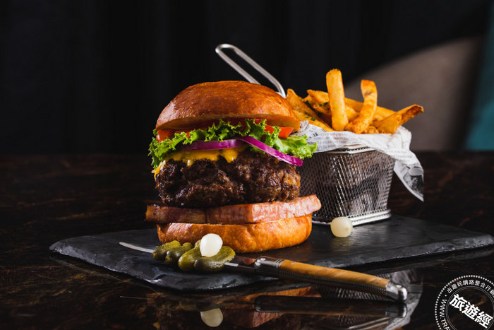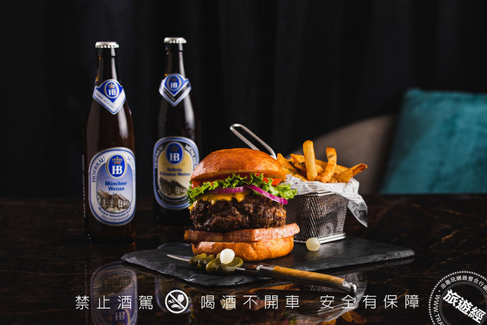 來自德國的皇家宮廷釀酒廠自1589年創立,巴伐利亞皇室一直壟斷著釀製小麥啤酒的特權長達200年,也使得皇家宮廷釀酒廠的啤酒滋味與眾不同,酒液呈現深琥珀色的黑啤酒,具有焦糖香味與絲絨般滑順口感,另一款白啤酒則帶著黃色泡沫,味道醇厚又甘甜清爽。經慕軒主廚嘗試,此酒款適合搭配餐飲團隊手工製作的安格斯黑牛肉漢堡,7盎司厚實漢堡排以純安格斯牛肉製成,簡單以鹽巴與黑胡椒調味,並加入牛油增添濃郁感與香氣,而漢堡麵包也是自行烘烤的奶油布里歐,口感香酥柔軟,一手抓起漢堡大口咬下,再搭配沁涼消暑的啤酒,讓無肉不歡的肉食控們大呼過癮!
