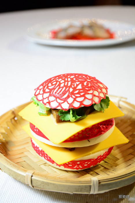 如果說造型突出,還有一款雖不算港點,但一出現在台北君品「頤宮」時,即相當受到矚目,師傅將被稱為「刈包」的虎咬豬升級了,不僅將刈包麵皮以法國麵粉加入牛奶製成,麵包皮香滑柔嫩又有微微奶香,再選用天然覆盆子果泥呈現鮮紅色的彩糖,仔細勾勒出如東方花瓷細緻美麗的糖網,更顯出其繽紛可人的外貌,內餡則是選用帶有軟骨的五花肉先以獨秘麻辣醬汁滷至軟嫩,抹上一層富滿顆粒的鹹甜花生醬後,再搭配微辣酸菜、新鮮香菜及起士片,就有視覺、味覺大大的滿足感!(需預訂,一個$480+10%)