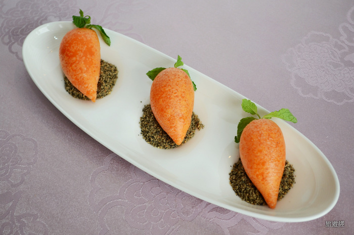 許師傅在金龍餐廳也有一款以可愛造型「紅蘿蔔」造型的創意點心──「迷你紅蘿蔔酥」,以蘿蔔絲、開陽(蝦米)、香菇、菜哺、豬肉炒熟,包裹在由加入紅蘿蔔汁的麵皮裡,下油炸酥,完成後,在迷你紅蘿蔔插上一朵薄荷葉,盤中鋪上花生粉與芝麻粉,看起來宛如新鮮出土的紅蘿蔔,相當精緻可愛。迷你紅蘿蔔酥每份三個NT$220。
