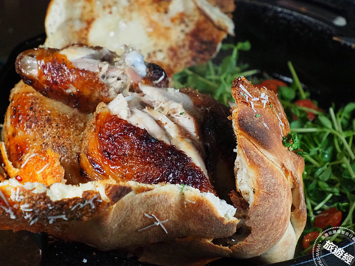而店中招牌為「烤雞」,其實是想保留的一個中心精神,因為一開始只有烤雞以及披薩,但對方的老宅拆除後,就沒有柴燒窯,無法在呈現這樣相同的料理,所以才想利用披薩餅皮包裹仿土雞,這裡的雞肉相較有嚼勁,若喜歡偏軟的食物,可以點選以泰國香米為主的「番紅花海鮮鑄鐵鍋巴飯」。另外,亦可點選「豬肉塔吉鍋」或「牛肉塔吉鍋」,「香料鹽烤現流海魚」、沙拉或義大利麵、可麗露等!