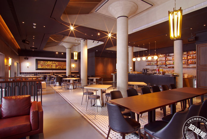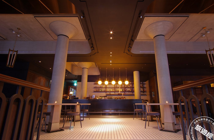 「華山町餐酒館」,將飯店的主題製酒、藏酒元素延伸於餐廳展現,設計風格融入英式復古酒吧概念,除了供應客房早餐外,不同的餐期也規畫提供酒吧輕食、自烘咖啡下午茶、特色調酒與精釀啤酒,此外「華山町餐酒館」也是欣賞無梁板建築的絕佳地點,挑高近4米的空間感,素面的漏斗圓柱呈現出建築的獨特質感。