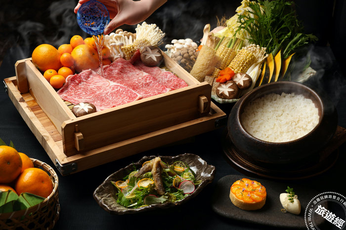 享用完蒸籠蒸後的底座湯底充滿頂級和牛油脂精華及濃郁果香,主廚特別加入宮崎縣擁有50年歷史的銀鏡頂級柚子胡椒提味,打造辛香開胃、風味別具的銀鏡柚子胡椒鍋,湯品入口微辛而回甘,香氣鮮甜,涮入精選小農時蔬及A5和牛肉片一同食用,更讓整體宴饗提升至全然不同層次。