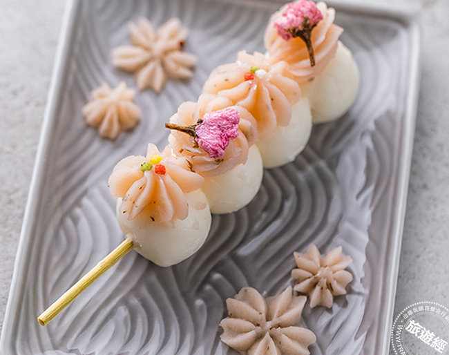 另外還有「櫻花串団子」,同樣由櫻花製成的櫻花粉加入白豆沙、鹽漬櫻花、鹽漬櫻花碎葉做成餡,餡料做成花朵造型鋪在白色串団子上,看起來粉嫩又典雅,搭配串団子品嚐非常夢幻。Q彈的串団子非常受歡迎,若因拍照或不小心與朋友閒聊一會兒再嚐,串団子仍充滿Q彈的好滋味!