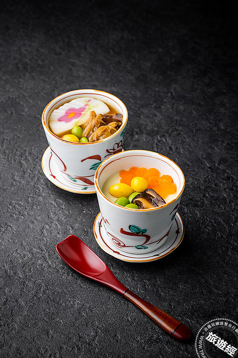 四、茶碗蒸:店中的茶碗蒸採用特製的柴魚高湯,擁有非常日式口味,加入雞肉、海鮮來作為鮮味的來源,因熬製高湯用的昆布裡含有 「穀氨酸」、海裡食材含有的「琥珀酸」都是鮮甜味的來源,也就是「京町 山本屋」茶碗蒸內擁有很多自然鮮味的來源,因入口若有鮮味,會讓人食用後在舌根留下美味的印象,而鮮味、甜味、視覺效果都是「京町 山本屋」茶碗蒸的重點。