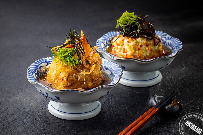 六、日式鰹節片炸豆腐:將包裹著鰹魚片的嫩豆腐炸得酥脆,搭配清爽解膩的白蘿蔔泥、櫻花蝦、蔥花增相增味,香口熱呼呼的炸豆腐於鰹魚高湯中,多重味覺享受一次到位。素食版的此道料理,則是將嫩豆腐裹以五色米果酥炸,其上綴以昆布絲、紫蘇葉絲,浸泡於素食高湯中。