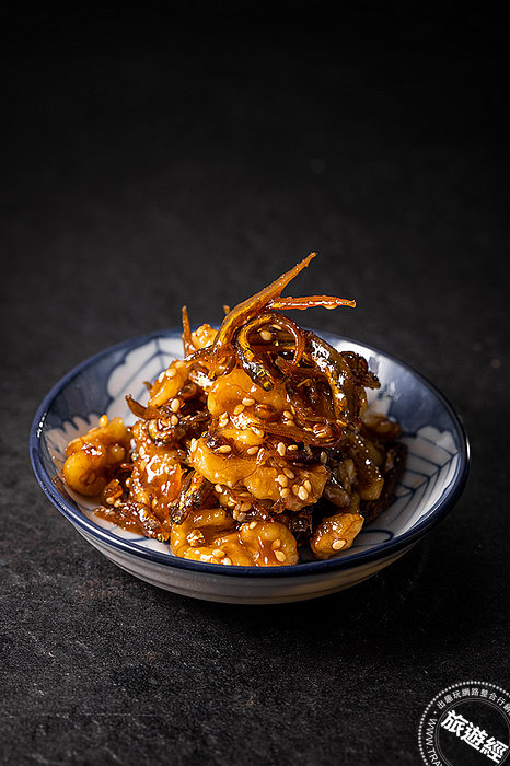 五、胡桃小魚乾佃煮;佃煮是讓食材煮到收汁後、光澤留在食材上的日本傳統烹調方式,此道料理以糖、醬油和麥芽將食材煮到收汁,小魚乾入味、胡桃也還保有原來的香氣,深受注重營養的食客喜愛,因胡桃、小魚乾都是很好的營養補給。