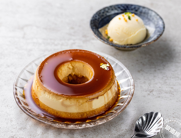 一、昭和風情布丁蛋糕:具濃濃復古氛圍,採用比一般砂糖貴20倍的三盆糖為食材,經過三次研磨製糖工程的淡黃色三盆糖,粒子細、在口中馬上化開,常用來製作日本高級和菓子。與一般市面上軟滑柔順的布丁口感不同,昭和風情布丁蛋糕嚐起來紮實卻又入口即化,自製焦糖醬甜香不膩口。撒一點兒金箔在昭和風情布丁蛋糕上,增添稍許貴氣。雖然布丁蛋糕外觀看來簡單,但嚐起來有多層次口感,佐以撒上京都鹹米果的香草冰淇淋,彷彿時光倒流,回到西洋文化進入日本的昭和時期,有著日本喫茶店品味著西洋布丁的感受。
