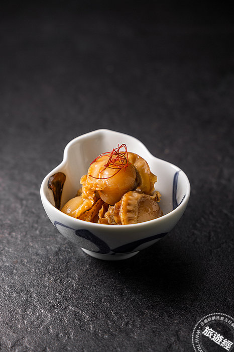 七、干貝時雨煮:時雨煮是日本料理中,加入生薑一起佃煮的鄉土料理,此料理法搭配貝類、魚類、牛肉。「京町 山本屋」特選受很多消費者喜愛的Q彈小扇貝,並撒上辣椒絲配色,看起來精緻又可口。