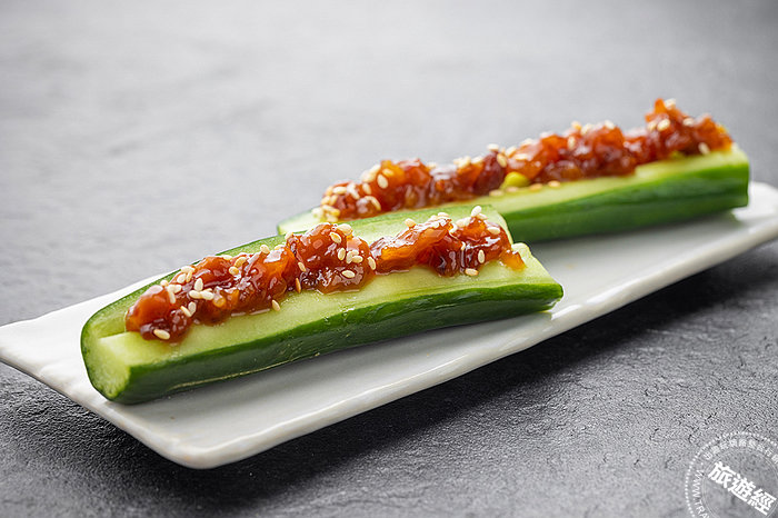 二、「諸味味噌小黃瓜」:諸味味噌採用四國味噌(燕麥味噌)製作,紅色味噌搭配綠色小黃瓜顏色很美。味噌與糖的比例成就最後味噌是否美好吃,需吃起來非常開胃甜鹹適中且還要回甘,最後在諸味味噌上撒上白芝麻,讓這道小點更顯精緻。