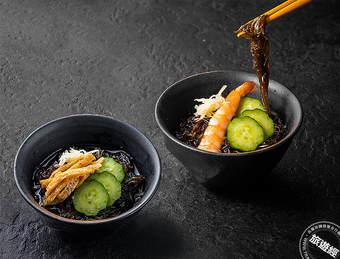 三、「水雲醋物」: 水雲是種藻類,為日本石垣島的特產,加入蝦子、小黃瓜片、薑絲,淋上「京町 山本屋」負責人山本先生的黃金比例三杯酢,爽口又美味,是推薦給喜愛開胃菜老饕的最佳涼拌菜。