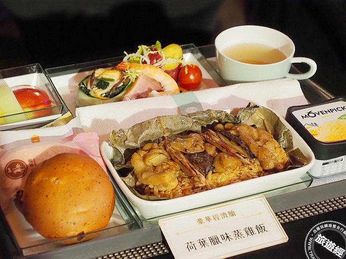 豪華經濟艙主菜──「荷葉臘味蒸雞飯」,將飄香四溢的臘肉、細嫩多汁的雞肉、彈牙的糯米飯與冬菇等佐料精華,包進清香的荷葉中,米粒浸潤著臘味的香氣與油脂,甘香味美。