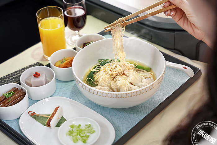 豪華商務艙主菜提供兩款暖心又暖胃的廣式湯麵餐點-「芋頭鴨絲米粉」、「蝦籽雲吞撈麵」,首波推出「芋頭鴨絲米粉」是道融入台灣在地食材,以芋頭取代原有雪菜的創新之作,用鴨架骨熬煮鮮甜高湯,搭配蝦米、香菇及油蔥酥爆香堆疊的香氣,芋頭鬆甜、鴨肉香美碰撞出絕妙的滋味。隨季節更迭,主菜選項將更換為「蝦籽雲吞撈麵」,每顆餛飩裡滿滿甜美蝦仁,用料紮實,餛飩皮薄卻能鎖住內餡湯汁精華,層層遞進的滋味,配上口感Q彈的麵條,及熱騰騰的美湯,療癒身心。