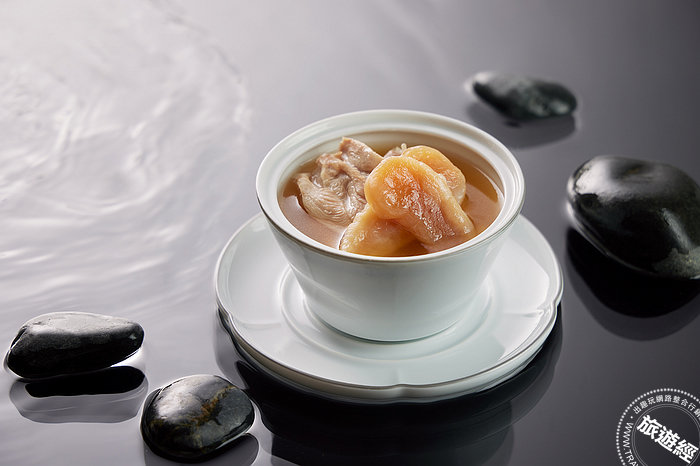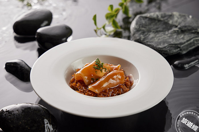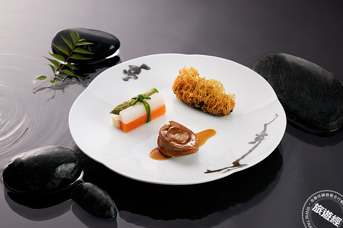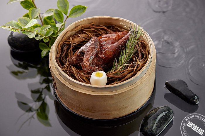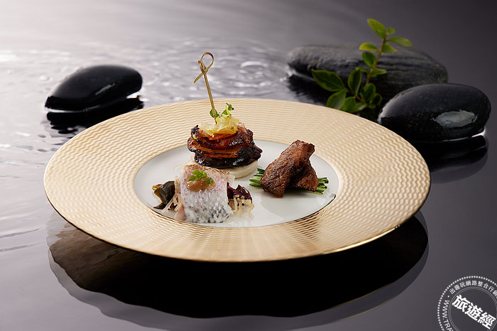還有「玻璃脆皮乳鴿伴糖心鴿蛋」以滷水慢煮乳鴿讓肉質保有鮮嫩的口感,接著乳鴿表層淋過皮水後風乾,形成晶瑩剔透的外皮,搭配糖心鴿蛋一同放在乾稻草之上,彷彿餐桌上的鳥巢,令人驚豔;「日本溏心吉品乾鮑伴脆百花遼參」將乾製八年的舊水溏心鮑魚,反覆日曬培烘,保留乾硬的表層,又使中間的溏心通透飽滿,主廚將日本的遼參中間夾著蝦膠,外皮裹上脆漿粉去酥炸,外層呈金黃色細絲花紋狀;發揮創意將傳統中式料理添入西式新意「義大利鮮茄油浸野生東星斑件」選用魚肉緊實有彈性的東星斑,搭配由義大利牛番茄與蛋液一同製作而成的番茄甜酸醬,淡淡果香十分迷人。