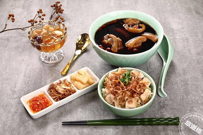 除了藥膳湯品之外,「黃金蔥酥雞腿肉飯」,為一碗具星級美味的米飯,以去骨雞腿肉丁,選用花蓮米的香甜Q彈,用雞油入味,充滿香氣而絲毫沒有油膩感,切塊的雞腿肉丁,搭配的三種小菜,包括:醃蘿蔔、韓式泡菜以及黃金蔥酥。其中必吃的當然是招牌黃金蔥酥,採用雲林優質的紅蔥頭,自家炒製到很乾爽,而且還保有蔥絲的口感,堪稱完美組合!