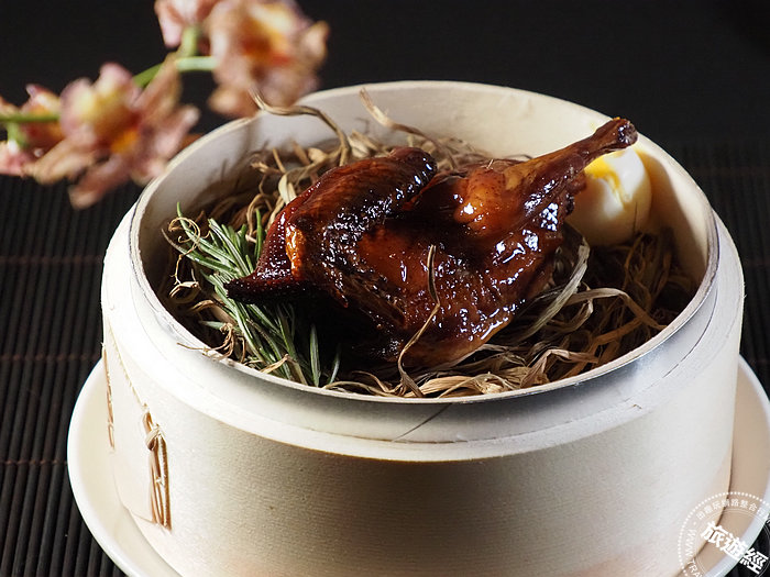玻璃脆皮乳鴿伴糖心鴿蛋:以滷水慢煮乳鴿讓肉質保有鮮嫩的口感,接著乳鴿表層淋過皮水後風乾,形成晶瑩剔透的外皮,吃起來皮脆肉滑又多汁,搭配糖心鴿蛋一同放在乾稻草之上,彷彿餐桌上的鳥巢。