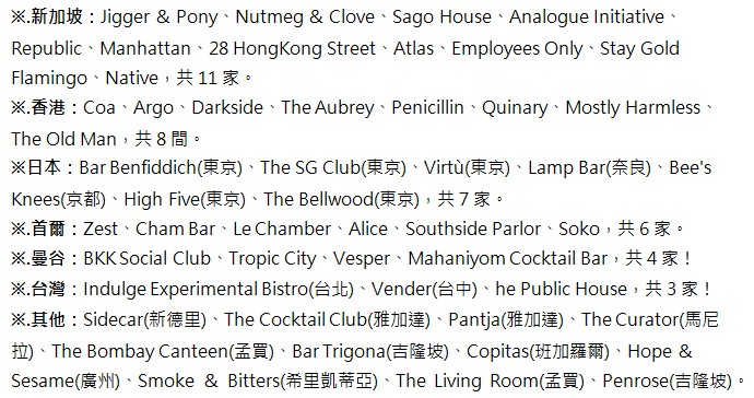 亞洲最具權威的雞尾酒潮流指標盛事「亞洲50最佳酒吧」,頒獎典禮今年首度移師香港舉行,超過800 位全亞洲最優秀的調酒師與業界精英於日前(18 日)雲集香港,慶賀亞洲酒吧業的輝煌成就,同時親身感受香港繽紛多元的魅力,而值得一提的是,今年來自17 個城市的獲獎酒吧,獲獎最多為新加坡共有11家上榜,其次為香港則是8家、日本7家,位於中環的COA 今再度奪下榜首寶座,COA 已連續五年上榜,更破紀錄第三年奪冠,而國人最關心的台灣,台北則有2家,以及台中1家上榜,台灣入榜包括:Indulge Experimental Bistro(台北)、Vender(台中)、he Public House等3家!