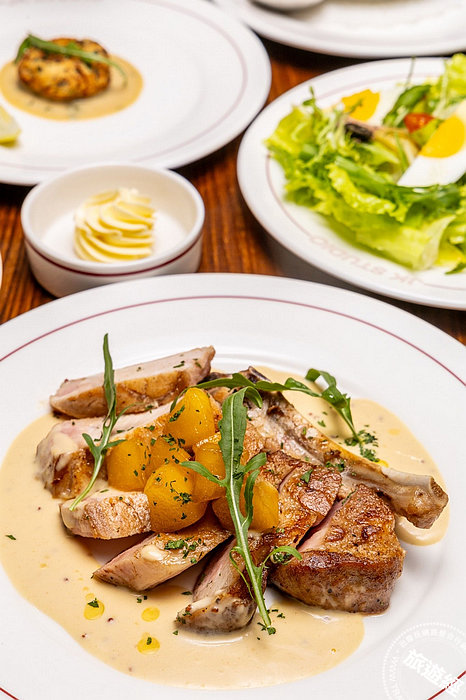 「JK STUDIO 法式餐酒館」也選用不少台灣在地食材來烹出法國菜,像是「諾曼第豬排」,挑選帶骨的噶瑪蘭黑豬,抹上胡椒、鹽後直接煎香,經過一次靜置,讓熟度更均勻完美,並有豐沛肉汁。一旁的蘋果絕對別錯過,挑選台灣產蘋果來製作,除了本身的果香,還帶濃郁的奶油與焦糖香,很具驚喜。