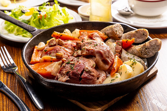 除了固定菜單,「JK STUDIO 法式餐酒館」也能端出季節菜色,例如「阿爾薩斯白酒酸菜豬腳鍋」,阿爾薩斯位處法國的東北部,毗鄰德國,因此也有經典的豬腳菜式,此菜兼容了德國人的粗曠與法國人的細膩,也匯聚了煙燻過的豬腳、法式普羅旺斯傳統香腸、馬鈴薯與各式蔬菜料,慢燉出多肉風味與獨特的酸香感,很具特色;「法式鄉村慢烤春雞」,每隻重450~600克的小春雞,先醃泡、風乾再炙烤,繁瑣工序之下,禽類鮮香風味得以濃縮,雞肉吃起來香嫩不柴、雞皮也薄透酥香,相當迷人。這兩道季節菜色,僅供應至9月底,採每日限量供應。