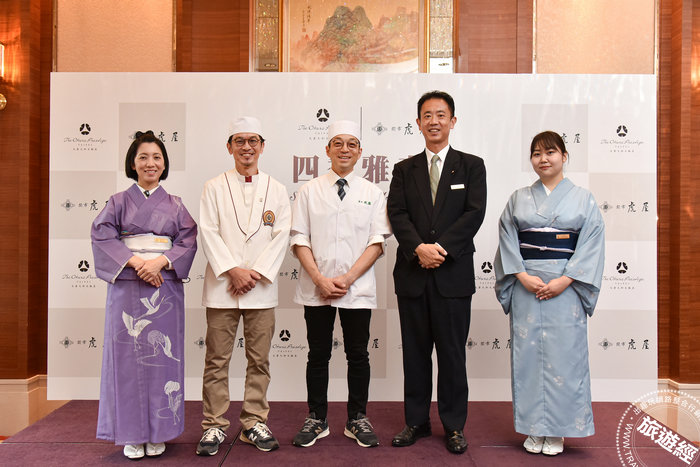 大倉久和邀請関市虎屋三代目古田敦資(中)與日本和菓子認定優秀職人窪田和人(左二)來台獻藝,右二為大倉久和大飯店總經理小田文雄。