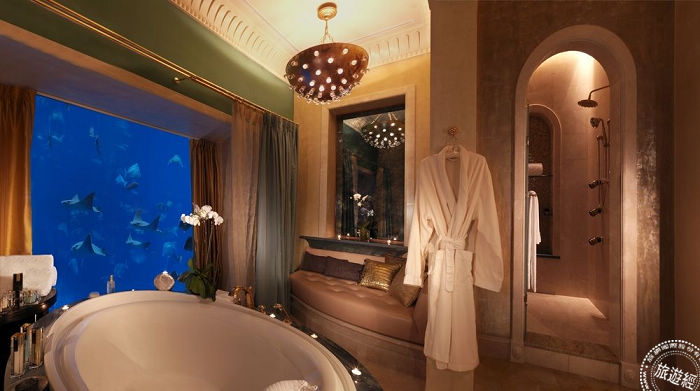 六、海龍宮之夢,住在深海裡,彷彿化身為尼莫與多莉,和魚群共游!位於杜拜「阿拉伯聯合大公國」棕櫚島亞特蘭蒂斯渡假飯店,可讓民眾一早睜開眼,即能目睹海底生物從眼前游過,棕櫚島亞特蘭蒂斯渡假飯店的海底套房可以二十四小時置身在深海世界。不僅有私人海灘隱逸漫步,也可跳進水裡與海豚共游,更可免費進入全中東最大的水上樂園。內設有世界各地美食餐廳及商店,不需出飯店便可環遊世界,除此之外,飯店更設有兒童俱樂部以及青少年的Club Rush俱樂部。