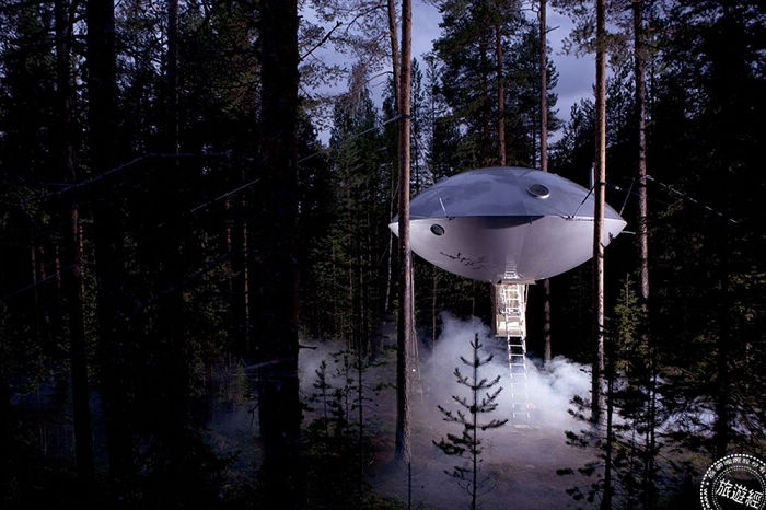 二、科技之夢──探索無垠宇宙,住太空船裡,同樣位於瑞典樹屋飯店,除了提供大小樹屋體驗外,最酷炫即是幽浮UFO外型的樹屋了,以混合材料建置而成,在充滿高科技感的UFO中,大人小孩彷彿在夢中與ET一起去冒險。