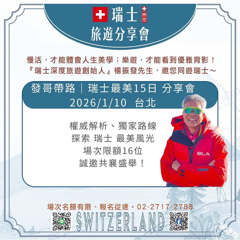 為了邀請您在台就能深入了解瑞士暑假的旅遊風情,特於1月10日在台北開設瑞士旅遊分享會,場次只限一場,名額限16位,請事先電話報名!
