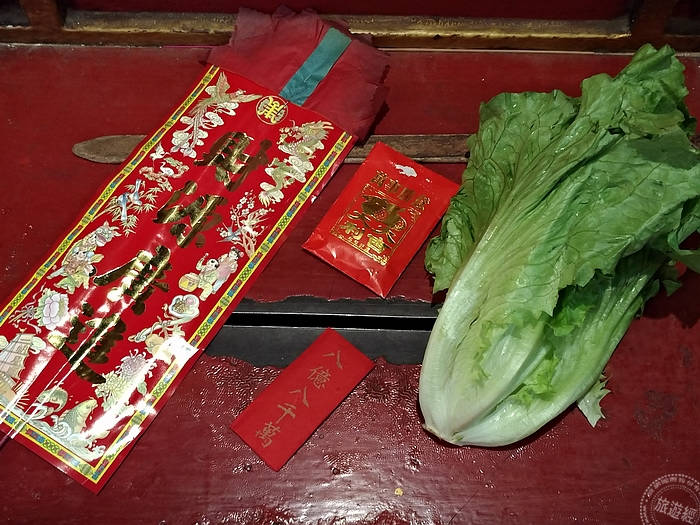 借庫時,廟方會給一棵生菜(生財)、花影、八寶包及庫銀(攝影:洪書瑱)