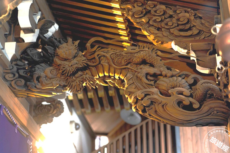 神社主殿前左右的龍雕呈現對應姿態,圖中為騰雲而上的「昇天之龍」;另一側則有自天而降的「降地之龍」。栩栩如生的雕刻象徵神靈的庇護與加持。©小網神社