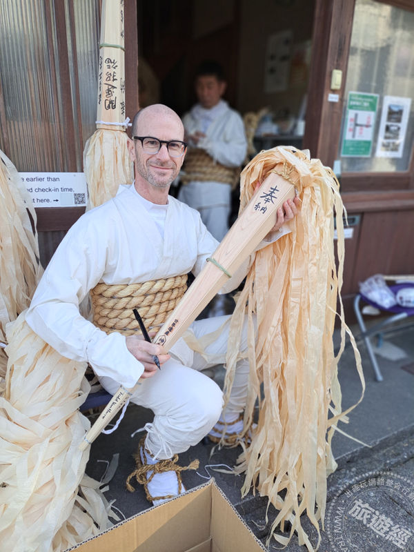 午後時分,「御燈祭」逐漸走入城市空間。來自各地「上り子」紛紛換上傳統白色祭裝,身著白色祭衣、腰綁粗麻繩,腳穿白布草鞋,手持尚未點火的五角形木製火把,虔誠恭敬寫上願望後,群集依序繞行新宮市街道,結隊參拜新宮市「阿須賀神社」、「熊野速玉大社」等神社。期間不少家庭三代同堂,老父親牽著年幼兒子的手,兩人都身著傳統白衣,在冬日的暖陽下漫步。