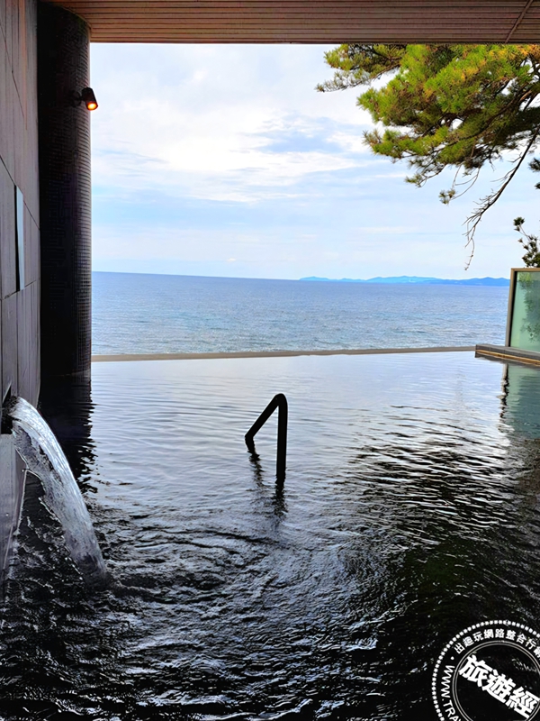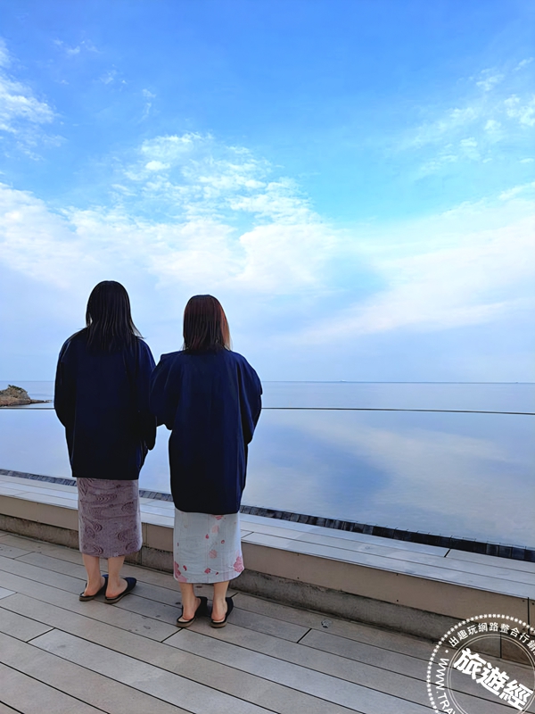 館內最具代表性的「三段湯露天風呂」,以三層階梯式浴池採無邊際設計向大海開展,三層不同高度的浴池由上而下延伸,最深處達120公分。站在最前方的立湯區,身體半浸溫泉,視線毫無阻礙地延伸至無盡的水平線。海天一色之間,人彷彿漂浮於海洋與天空交界處——隨著時間流轉,從晨曦金輝到夕燒雲霞,海天一色的景致令人屏息,每一刻都是獨一無二的絕景。