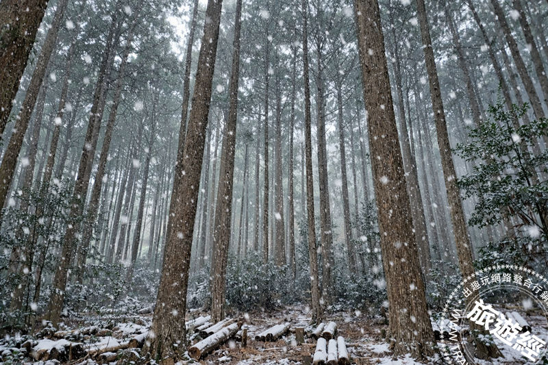 圖說:抬頭望向高聳的杉木林,白色雪花在枝葉間緩緩飄落,讓整座山林多了一份夢境般的純淨。 (攝影/ 廖晨光)