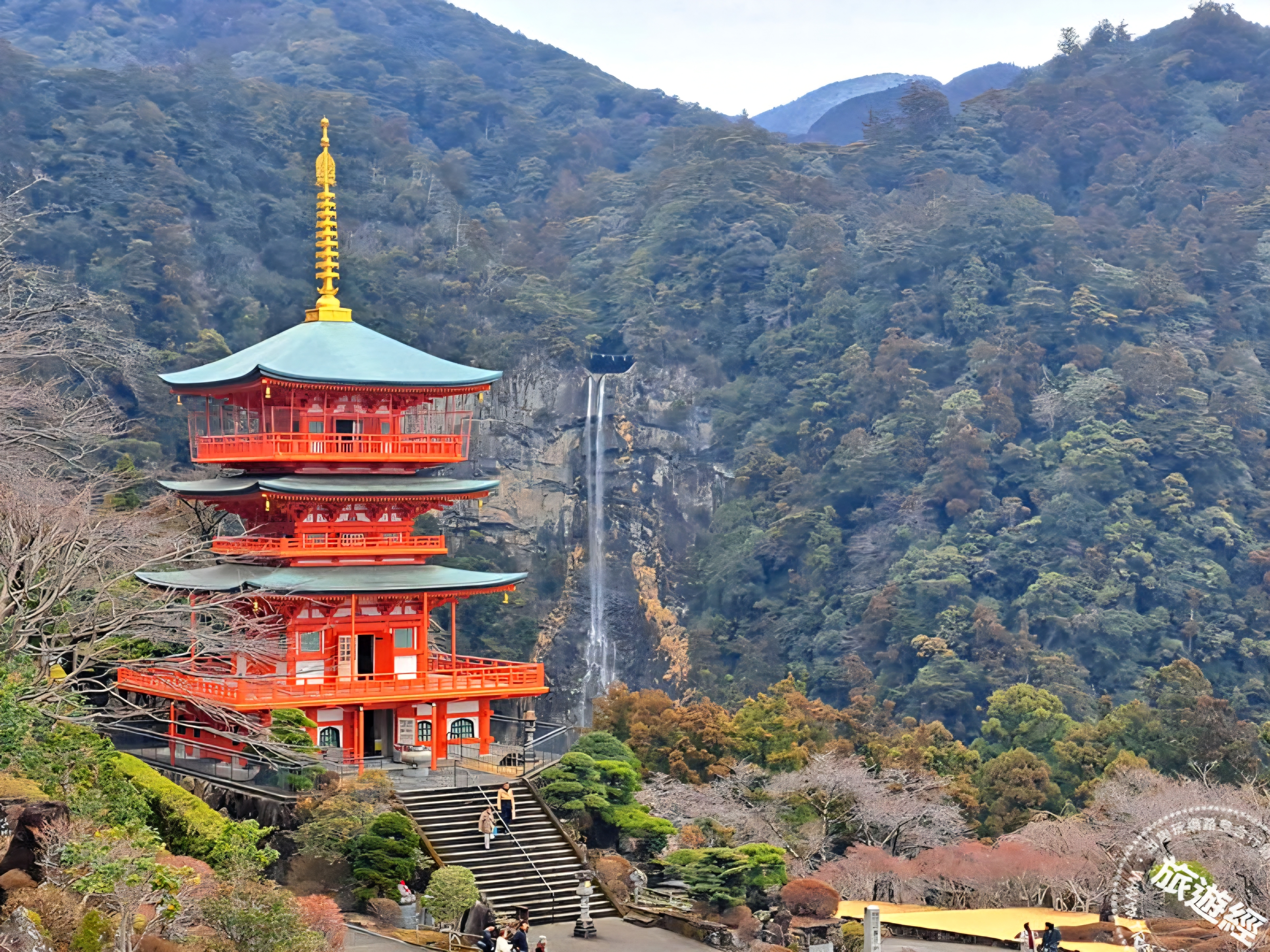 自「大門坂」拾級而上,循中邊路古道前行約2.7公里即可登頂參拜世界遺址「熊野三山」之「熊野那智大社」與相鄰的「青岸渡寺」。沿途杉木參天、石階覆苔,林蔭交織間瀰漫靜謐而莊嚴的氛圍。行至「青岸渡寺」旁,可見朱紅色的青岸渡寺三重塔矗立山腰,與後方自133公尺高處傾瀉而下的那智瀑布相互輝映。白瀑如練直落深潭,水霧繚繞山谷,與三重塔、蒼林構成熊野最具代表性的經典景觀。