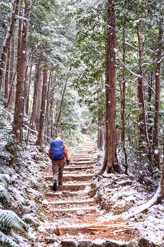 圖說:走在熊野古道山林間,天空忽然靜靜飄下雪花。落在杉木枝頭,也落在早已覆滿青苔的石階上。山林變得更安靜了,彷彿連時間,也慢慢放輕了腳步。 (攝影/ 廖晨光)