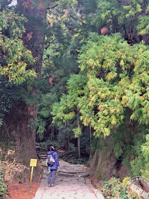 身穿「平安衣裳」的旅人行走在「夫婦杉」與積滿青苔的石階之間。 (攝影/ 廖晨光)