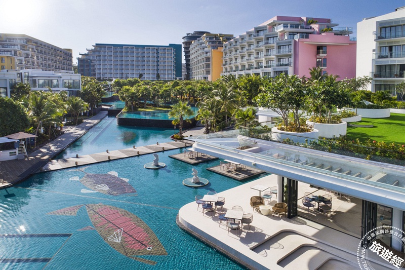 除了地理位置優越,飯店巧妙融合了「現代公寓的居家溫馨」與「五星級飯店的精緻服務」,透過明亮的色調與開放式設計,將海島的自然採光發揮得淋漓盡致,色彩繽紛的建築連接著巨大的南洋風泳池,為靜謐的翡翠灣注入了年輕且現代的時尚活力。
