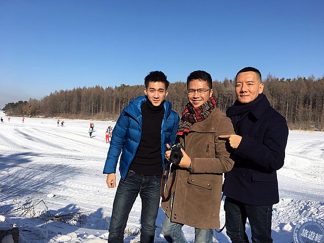 (左起)新生代藝人劉道玄、知名旅遊作家溫士凱及文創藝術家田定豐,在吉林長春淨月潭參觀國際越野滑雪賽事。(圖片提供╱李麗文)