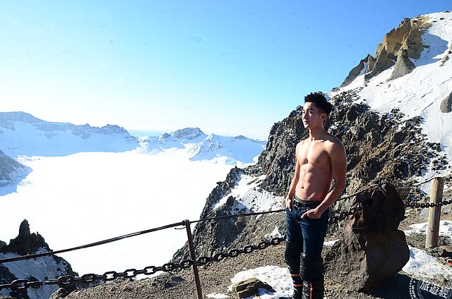 輸人不輸陣,在長白山天池劉道玄一看旁人零下20度脫上衣,也來嘗試這凍感,展現他的好身材。(圖片提供╱李麗文)
