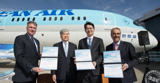 大韓航空會長趙亮鎬(左二)、社長趙源泰(左三)、波音東北亞區銷售副總裁安瑞生(Rick Anderson∙左一)和GE航空集團副總裁夏晨善(Chaker Chahrour∙右一)簽約大韓航空首架波音787-9交付證書後拍照留念。(圖片提供/大韓航空)