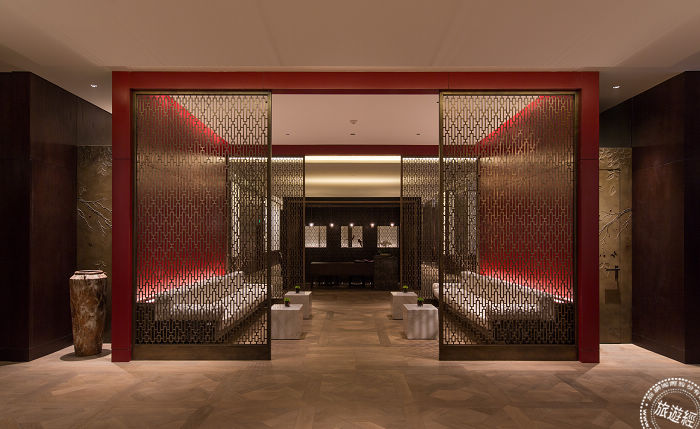飯店對稱的格局打造入口與大堂,將貫穿格柵與屏風的元素,甫進入酒店,映入眼簾的即是高約兩層樓的「山城意向」陶瓷藝術牆。整面牆是以俯視山城屋脊的視覺效果為畫面,以在中國瓷器名城—景德鎮手工燒制完成的深淺瓦色瓷片拼迭而出,輔以古舊的木質雕梁點綴,由空中鳥瞰重慶特有的山城建築線條;而酒店大堂,引人注目的是屏風中間鑲嵌著景泰藍勾金的山茶花圖案,將重慶市花—山茶花巧妙融入,其實不僅僅只有大堂,大堂酒吧—巴廊,在挑高兩層樓的主題牆,就有臺灣圖案設計師運用山茶花造型描繪出花雨紛飛的3D景象,白牆上刻畫著千百朵錯落有致的山茶花。而山茶花,也運用在宴會廳素雅的壁布牆面,在水晶吊燈下,如一盞盞凍在冰塊中的山茶花意境。