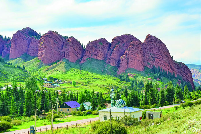 Jeti-Oguz奧古茲山谷以紅色巨石聞名,Jeti 是7的意思,Oguz是公牛,意為7隻公牛頭,巨石主體為大紅色沉積岩,受到周圍山脈河流雕蝕而成。