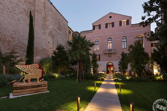 多數旅客都會搭乘計程車船來到飯店,從運河畔的碼頭進出,穿越這個獨立花園,便能欣賞園內有著以威尼斯城徽「飛獅」為意象的藝術品,除了向威尼斯輝煌的歷史致敬,也成功地融合古典與當代藝術的巧思設計。