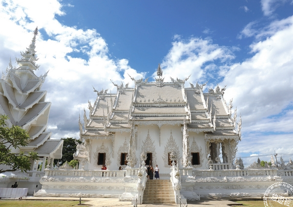 龍坤藝術廟位於泰北清萊,因為整間 寺廟顏色雪白又稱為白廟。白廟由泰國著名藝術家Chalermchai Kositpipat設計,是清萊地區最受歡迎的廟宇,佔地遼闊的白廟一直持續建設中,每次到訪都有不同的景象。白廟不同於泰國傳統的寺廟,以純白做底,銀鏡鑲邊,反射出奪目的光芒,象徵著佛陀的純潔和佛的智慧照耀著全宇宙,入口處的水池為地獄造景,穿過拱橋可達正殿,象徵離開地獄直達天堂。除了純白建築,金碧輝煌的廁所也非常出名,是旅遊白廟「必上」的知名景點。
