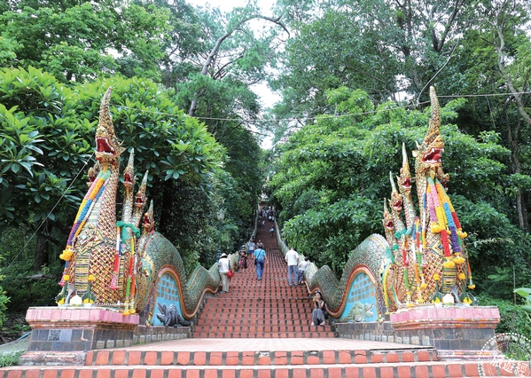 位於清邁素帖山半山腰的Wat Phra Doi Suthep素帖寺又稱雙龍寺,從清邁市區出發大約40分鐘車程,素帖山風景優美視野極佳,可遠眺清邁風景。從停車場可選搭電梯或走309階梯上山,大多數的遊客都是電梯上、步行下,這樣比較輕鬆又不會錯過雙龍寺階梯的2條巨龍。雙龍寺以金碧輝煌的大金塔聞名,裡面供奉釋迦牟尼佛的真身舍利,終年香火鼎盛,許多信眾遠道而來虔誠禮佛。泰國的寺廟有生肖之分,雙龍寺是屬羊的廟宇,如果生肖屬羊就非常適合來這裡參拜。