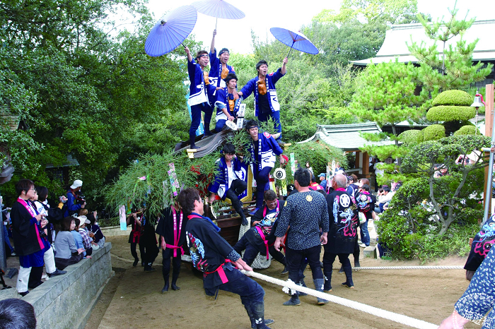岡山縣內三大山車祭典之一,由眾人合力將18輛華麗的山車以及神轎「千歲樂」邊推帶拉,爬上斜度約16度、長達80公尺的緩坡。欣賞山車同時,還能聆聽被指定為無形民俗文化財的祭典音樂祭囃子。