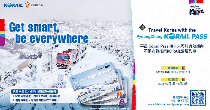 「平昌KORAIL PASS」鐵路通券預購日期自10月10日開始起至12月10日,透過平昌KORAIL PASS的官方網站訂購,能在2018年2月1日∼3月25日的期間內,不限次數搭乘韓國鐵道公社KORAIL營運的鐵路列車。包括:KTX、KTX-山川、ITX-新村號、ITX-青春列車、新村號、無窮花號、Nuriro號、通勤列車、五大區觀光列車(O、V、S、G、A、DMZ-TRAIN)都可搭乘。只要進入網站,選擇搭乘路線、劃位,將車票列印出後,持列印之車票至韓國搭乘指定使用之列車即可。另外,也能持列印之車票及相關可驗明身分之證件至指定地點換取紀念交通卡,卡片上註記有平昌KORAIL PASS編號,兼具平昌KORAIL PASS的功能,還內附5,000韓元儲值金,讓民眾轉乘公車、地鐵上更加便利。
