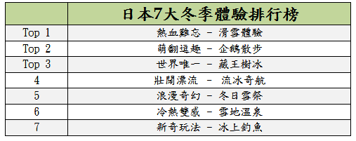 台灣的冬季雖在寒流之季,氣溫偏冷,但與國外的「凍」似乎還有點差距,在國旅部份許多人喜好在國內泡溫泉取暖,但國外因為因冬季而有了雪祭,因此國人更愛在國外找「玩意」!有旅遊業者在冬季來臨之前,調查了國人到鄰近的雪國日本時,除了賞賞雪、泡泡湯之外,「冬天玩日本 你最想玩什麼」網路調查,票選出日本7大冬季體驗排行榜,結果已出爐!