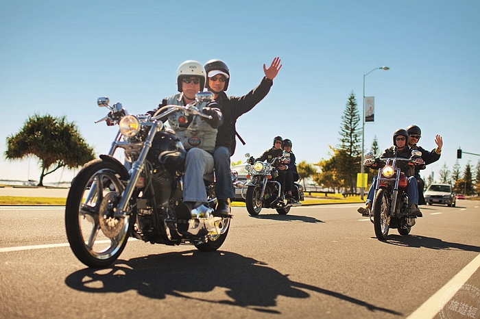昆士蘭的黃金海岸是一處充滿陽光與活力的知名度假勝地,其實遊客並非只能透過巴士或汽車的窗口來觀看一成不變的風光,遊客可以在當地哈雷騎士的帶領下,帥勁十足地跨上閃亮亮的哈雷機車,迎風奔馳在綿延 57 公里長的迷人海岸線,或穿梭在內陸的原始熱帶雨林中,深入探索這座濱海城市的獨特魅力。
