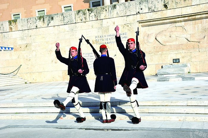 ▲憲法廣場上的衛兵穿著希臘傳統服飾,百褶短裙、緊身白褲襪、飾有大圓球的木鞋,肅穆的進行衛兵交接儀式。