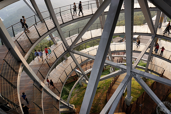 到丹陽當然不能錯過位於陽坊山頂的滑翔場,能登高遠眺將丹陽市區景色全納入眼底,想登高望遠,在丹陽除了搭乘滑翔翼體驗外,亦可以選擇至去(2017)年7月甫完成的丹陽SKY WALK,遠看如一座鏤空的蛋形建築,上面有觀景台、高空滑索和生態公園。沿著螺旋梯漫步而上,最後可到達距離南漢江面120公尺的瞭望台,瞭望台外側還有全透明的天空步道,站在這裡能夠欣賞到丹陽明山的「小白山」支流以及南漢江周邊之美,而丹陽的休閒體驗活動,還能選擇漂流、水上旅遊、陶土飛靶射擊,丹陽還有韓國中部地區最大的雪撬場!